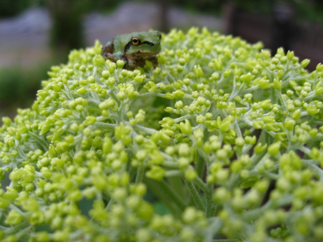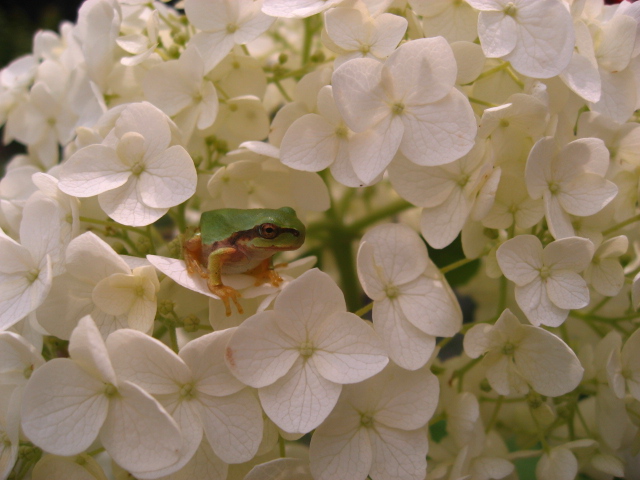 夕方、アマガエルがアナベルちゃんの上におりました。