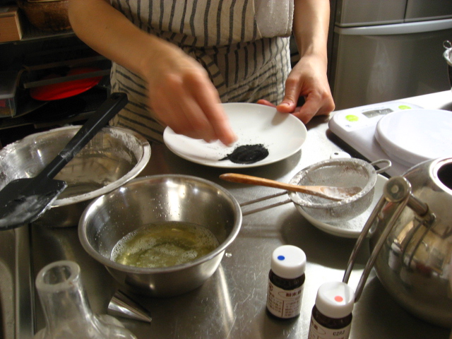 そこに色の粉を混ぜる、これは黒を入れてるところ、