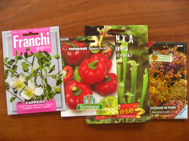 左からケーパー、トウガラシ、サラセニア、いろんな花の混ざった種です。