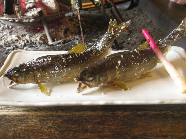 生きたまま、口に棒をさされ炭火焼きされる鮎たち・・拷問の世界です、あわわ