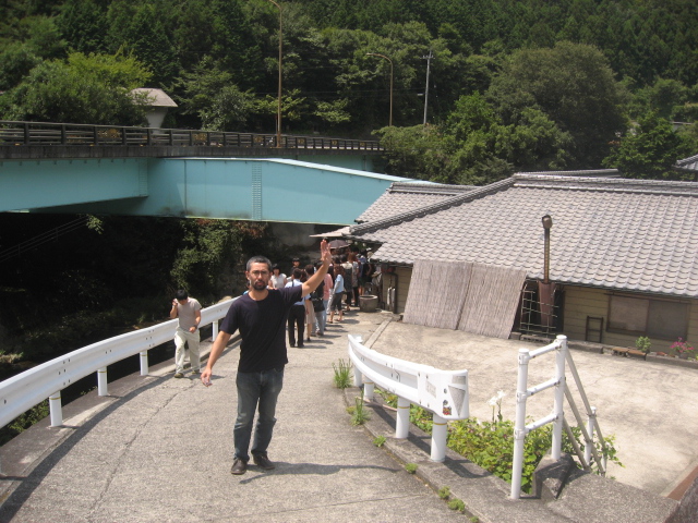 ただでさえつり橋こわいっちゅうのに、蜂に注意の看板もあって、こわさ倍増